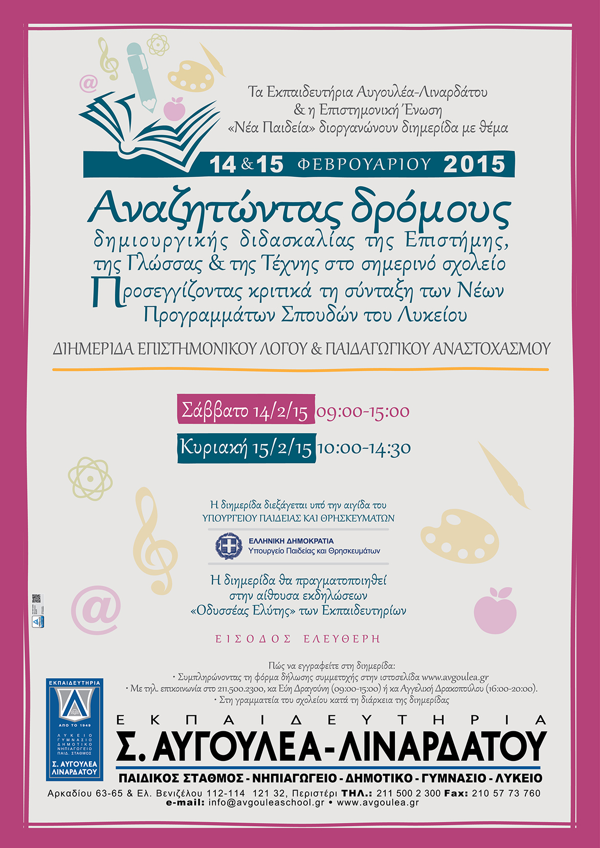 Για περισσότερες πληροφορίες και online εγγραφή, επισκεφθείτε τον ακόλουθο σύνδεσμο –> http://www.avgouleaschool.gr/index.php/νέα/715-διημερίδα-φιλολόγων-14-15-φεβρουαρίου-2015