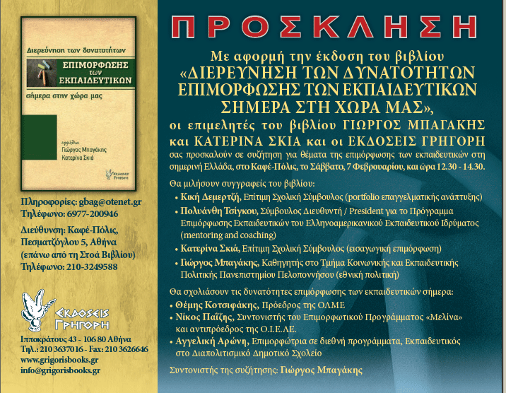 Με αφορμή την έκδοση του βιβλίου «ΔΙΕΡΕΥΝΗΣΗ ΤΩΝ ΔΥΝΑΤΟΤΗΤΩΝ ΕΠΙΜΟΡΦΩΣΗΣ ΤΩΝ ΕΚΠΑΙΔΕΥΤΙΚΩΝ ΣΗΜΕΡΑ ΣΤΗ ΧΩΡΑ ΜΑΣ», οι επιμελητές του βιβλίου ΓΙΩΡΓΟΣ ΜΠΑΓΑΚΗΣ και ΚΑΤΕΡΙΝΑ ΣΚΙΑ και οι ΕΚΔΟΣΕΙΣ ΓΡΗΓΟΡΗ σας προσκαλούν σε συζήτηση για θέματα της επιμόρφωσης των εκπαιδευτικών στη σημερινή Ελλάδα, στο Καφέ-Πόλις, το Σάββατο, 7 Φεβρουαρίου, και ώρα 12.30 – 14.30.