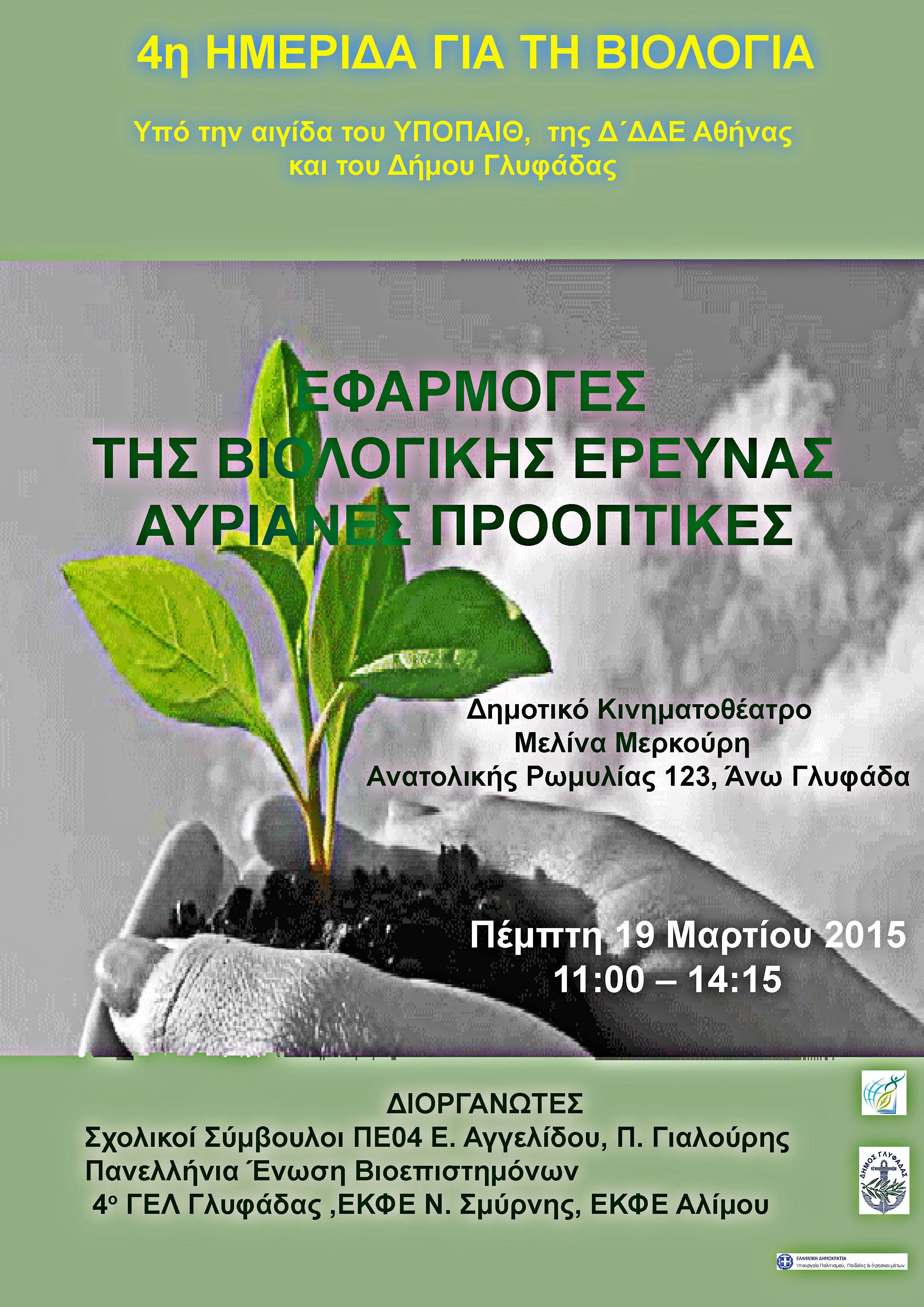 Οι σχολικοί σύμβουλοι ΠΕ04 της Δ΄ ΔΔΕ Αθήνας κ/α Ε. Αγγελίδου και κ. Π. Γιαλούρης, το 4ο ΓΕΛ Γλυφάδας, η ΠΕΒ (Πανελλήνια Ένωση Βιοεπιστημόνων) και τα ΕΚΦΕ Αλίμου και Ν. Σμύρνης οργανώνουν στα Νότια Προάστια της Αττικής την: