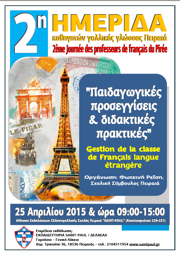 Η Σχολική Σύμβουλος Καθηγητών Γαλλικής Γλώσσας της περιφέρειας Πειραιά, Φωτεινή Ρεΐση σας προσκαλεί να τιμήσετε με την παρουσία σας την Ημερίδα που θα πραγματοποιηθεί το Σάββατο, 25 Απριλίου 2015, στις 09:00-15:00, στην Ελληνογαλλική Σχολή SAINT-PAUL του Πειραιά, με θέμα : «Gestion de la classe de français langue étrangère- Παιδαγωγικές προσεγγίσεις & διδακτικές πρακτικές».