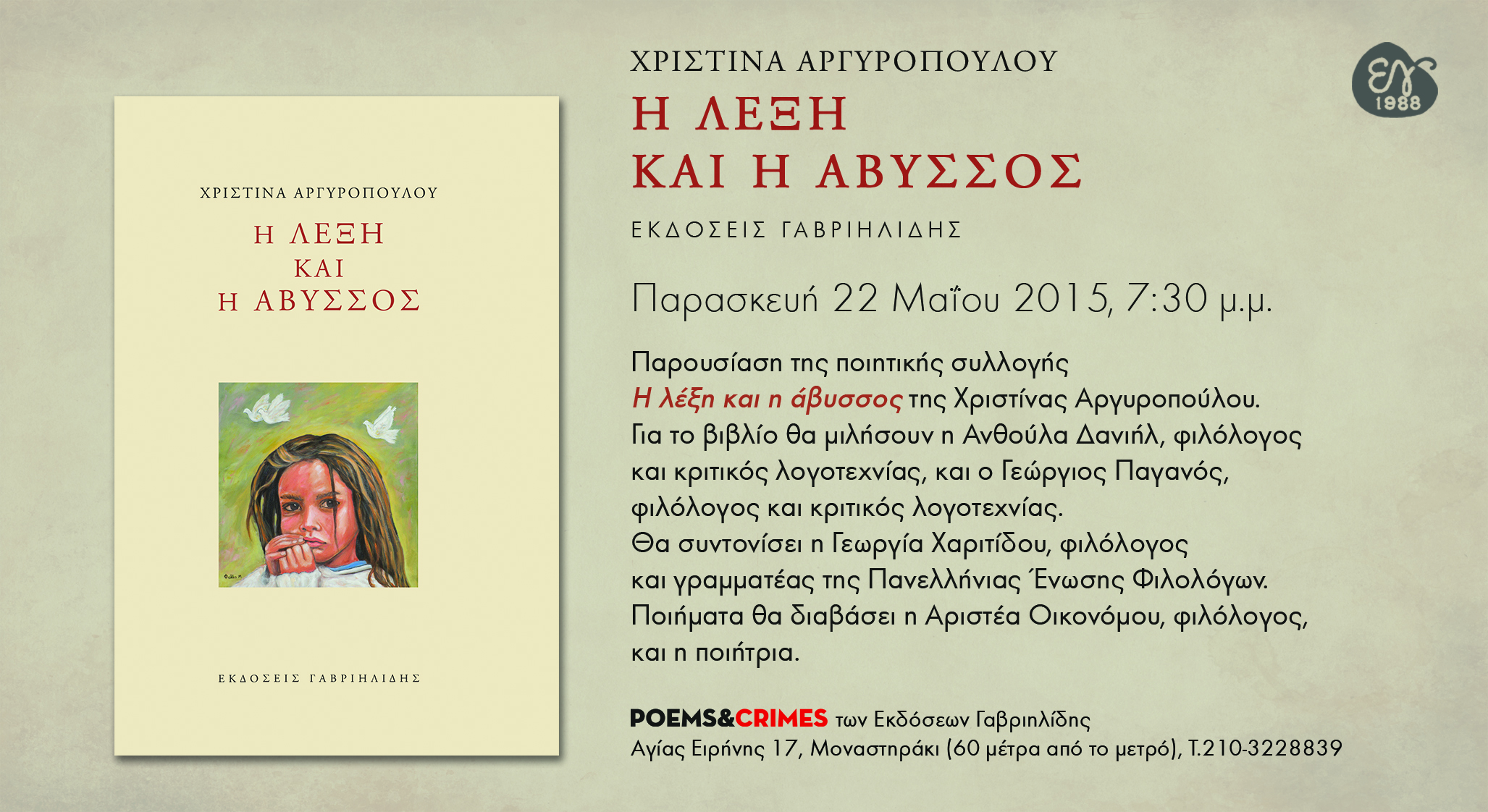 Ποιητική συλλογή Posted on 08/05/2015 by vasdim Πατήστε στην εικόνα για να δείτε την Πρόσκληση Η Χριστίνα Αργυροπούλου μας προσκαλεί στην παρουσίαση της ποιητικής της συλλογής «Η λέξη και η άβυσσος» την Παρασκευή 22 Μαΐου 2015, στις 7:30 μ.μ., στις Εκδόσεις Γαβριηλίδη, Αγίας Ειρήνης 17, Μοναστηράκι. Κοινοποιήστε: Μοιραστείτε στο X(Ανοίγει σε νέο παράθυρο) Χ Mοιραστείτε στο Facebook(Ανοίγει σε νέο παράθυρο) Facebook Μου αρέσει! Φόρτωση...