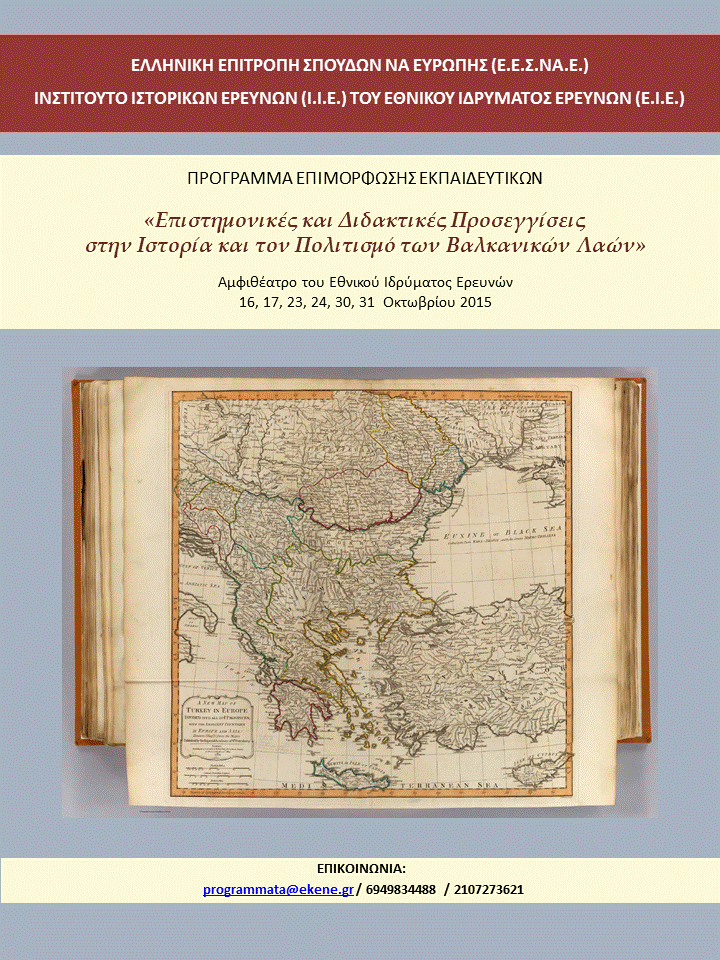 H Ελληνική Επιτροπή Σπουδών Νοτιοανατολικής Ευρώπης (Ε.Ε.Σ.ΝΑ.Ε.) σε συνεργασία με το Ινστιτούτο Ιστορικών Ερευνών (Ι.Ι.Ε.) του Εθνικού Ιδρύματος Ερευνών (Ε.Ι.Ε.) υλοποιούν Πρόγραμμα Επιμόρφωσης Εκπαιδευτικών Πρωτοβάθμιας και Δευτεροβάθμιας Εκπαίδευσης με θέμα: