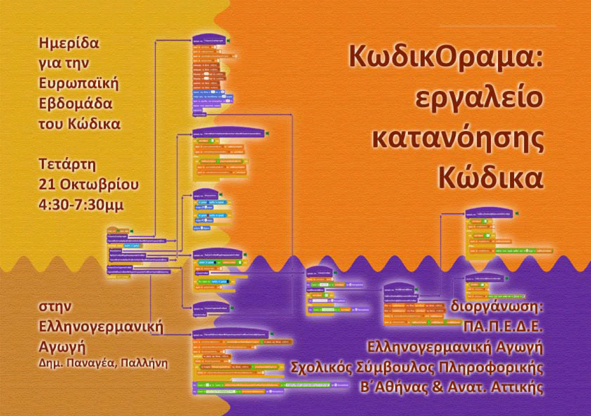 Στο πλαίσιο της Εβδομάδας του Κώδικα, την Τετάρτη 21 Οκτωβρίου 2015, 4:30-7:30 μ.μ., στο σχολείο Ελληνογερμανική Αγωγή στην Παλλήνη, η ΠΑ.Π.Ε.Δ.Ε. (Πανελλήνια Παιδαγωγική Εταιρεία Δευτεροβάθμιας Εκπαίδευσης), το Τμήμα Έρευνας και Ανάπτυξης της Ελληνογερμανικής Αγωγής και ο Σχολικός Σύμβουλος Πληροφορικής Β’ Αθήνας και Ανατ. Αττικής διοργανώνουν ημερίδα με θέμα «ΚωδικΟραμα: Εργαλείο κατανόησης Κώδικα».