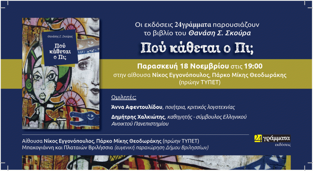 Παρουσίαση του πολύ ενδιαφέροντος βιβλίου του επίλεκτου Μαθηματικού Θανάση Σ. Σκούρα, την Παρασκευή 18 Νοεμβρίου στις 7:00 μ.μ. στην αίθουσα Νίκος Εγγονόπουλος, πάρκο Μίκης Θεοδωράκης (Πρώην ΤΥΠΕΤ) , Μπακογιάννη και Πλαταιών, στα Βριλήσσια.
